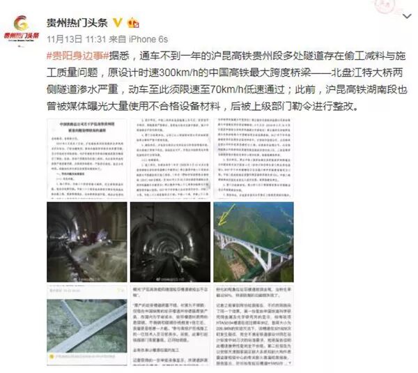 “原设计时速300km/h的中国高铁最大跨度桥梁——北盘江特大桥两侧隧道渗水严重,动车至此必须限速至70km/h低速通过;此前,沪昆高铁湖南段也曾被媒体曝光大量使用不合格设备材料,后被上级部门勒令进行整改。”该微博不仅配有隧道、大桥图片,还配发了中国铁路总公司的通报文件照片若干张。