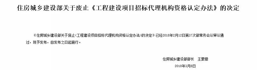 近日住建部发文,正式废止《工程建设项目招标代理机构资格认定办法》。