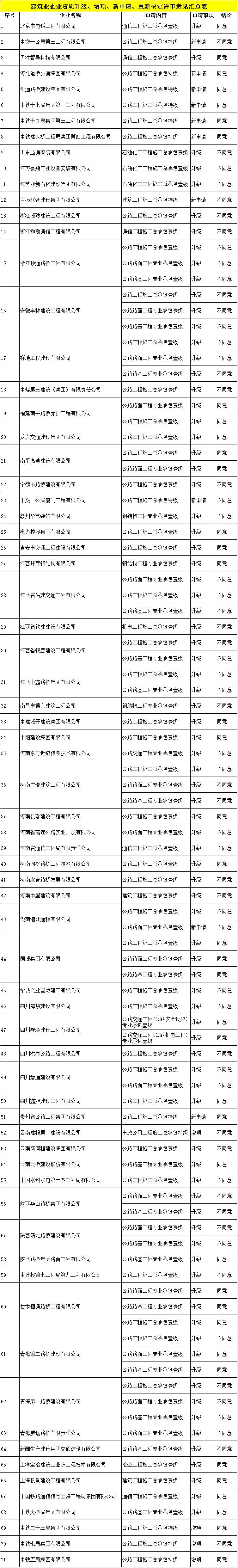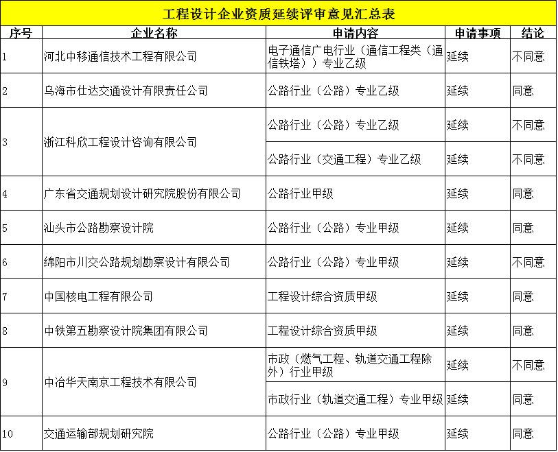 其中工程设计企业资质延续评审包含10家企业,12个申请内容;工程设计企业资质升级、增项、新申请、重新核定评审有111家企业,128个申请内容;工程勘察企业资质升级、增项、新申请、重新核定评审中有9家企业,9个申请内容;建筑业企业资质升级、增项、新申请、重新核定评审中有71家企业,98个申请内容。