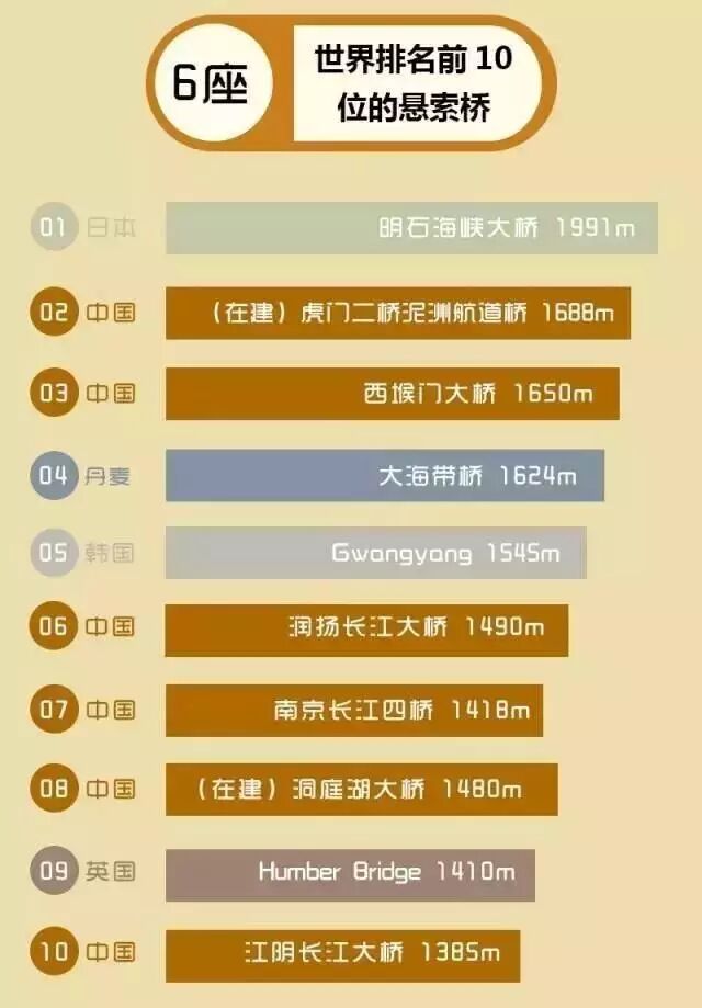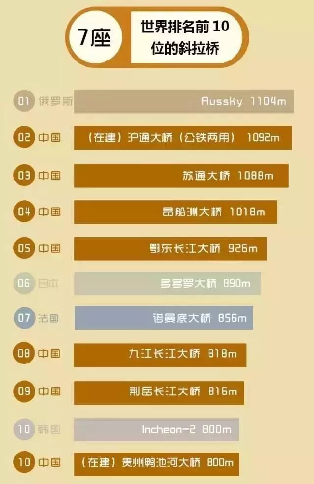 五年来,世界排名前10位的跨海长桥中,中国已经占据6座;世界排名前10位的斜拉桥,中国已经占据7座;世界排名前10位的悬索桥,中国已经占据6座。(资料来源:交通运输部、《桥梁》杂志)