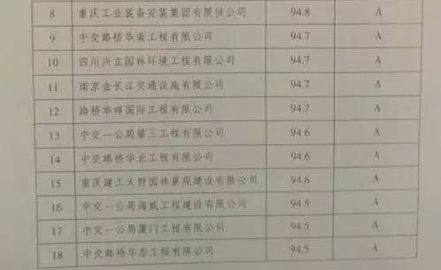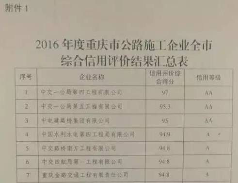 图为2016年度重庆市公路施工企业全市综合信用评价结果汇总表